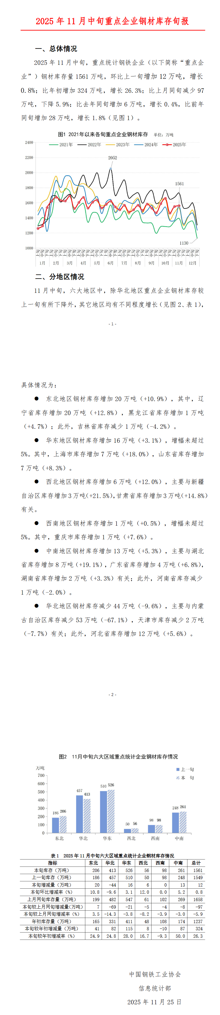 2025年11月中旬,重点统计钢铁企业钢材库存量1561万吨,环比上一旬增加12万吨,增长0.8%;比年初增加324万吨,增长26.3%;比上月同旬减少97万吨,下降5.9%;比去年同旬增加6万吨,增长0.4%,比前年同旬增加28万吨,增长1.8%。