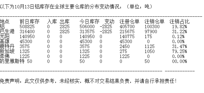 LME 10月13日铝库存分布情况