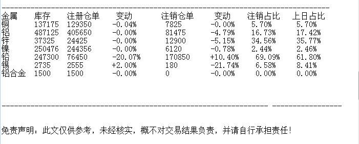 LME 10月20日基金属仓单数据