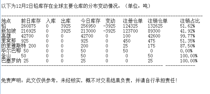LME 12月2日铅库存分布情况