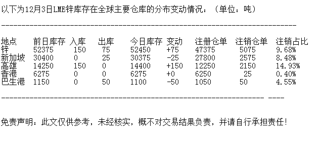LME 12月3日锌库存分布情况