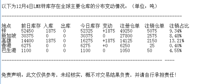 LME 12月4日锌库存分布情况