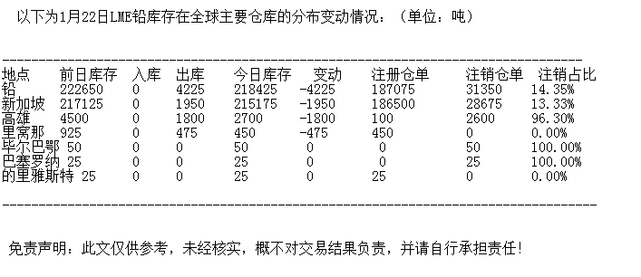 LME 1月22日铅库存分布情况