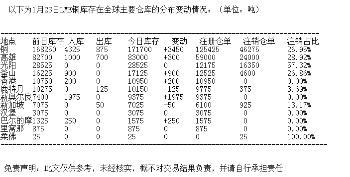 LME 1月23日铜库存分布情况