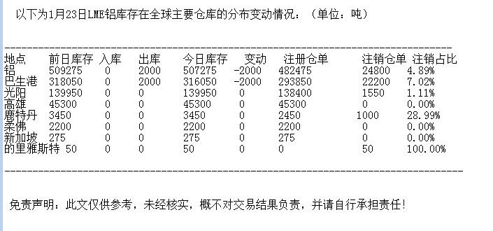 LME 1月23日铝库存分布情况