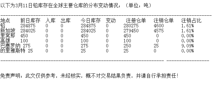 LME 3月11日铅库存分布情况