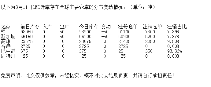 LME 3月11日锌库存分布情况
