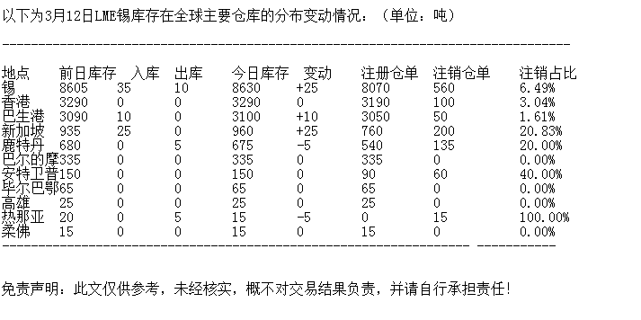 LME 3月12日锡库存分布情况