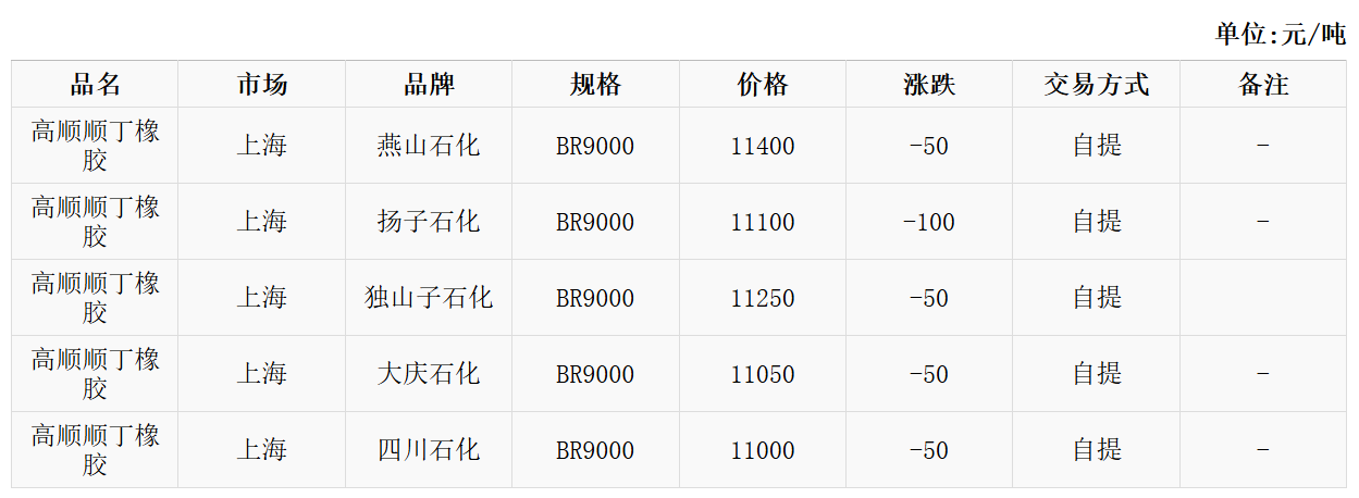 10月27日上海市场高顺顺丁橡胶价格区间下跌