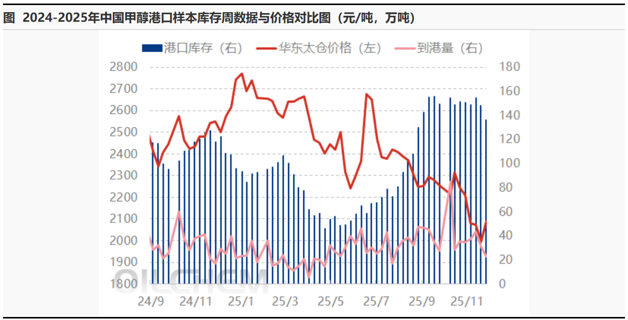 截至2025年11月26日,中国甲醇港口库存总量在136.35万吨,较上一期数据减少11.58万吨。其中,华东地区去库,库存减少8.03万吨;华南地区去库,库存减少3.55万吨。