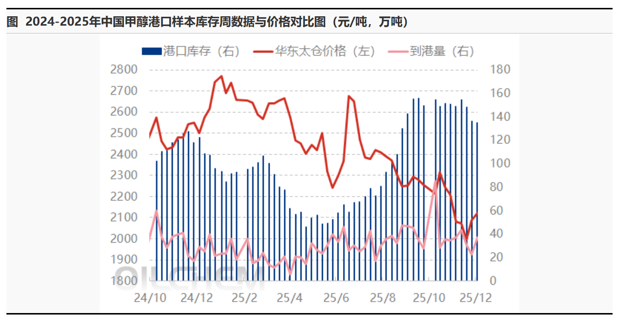 截至2025年12月3日,中国甲醇港口库存总量在134.94万吨,较上一期数据减少1.41万吨。其中,华东地区累库,库存增加0.13万吨;华南地区去库,库存减少1.54万吨。