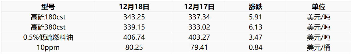 12月18日新加坡燃料油现货市场价格上调