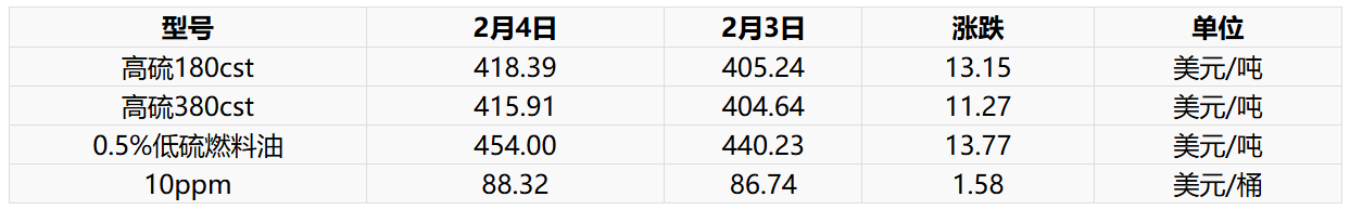 2月4日新加坡燃料油现货市场价格上调