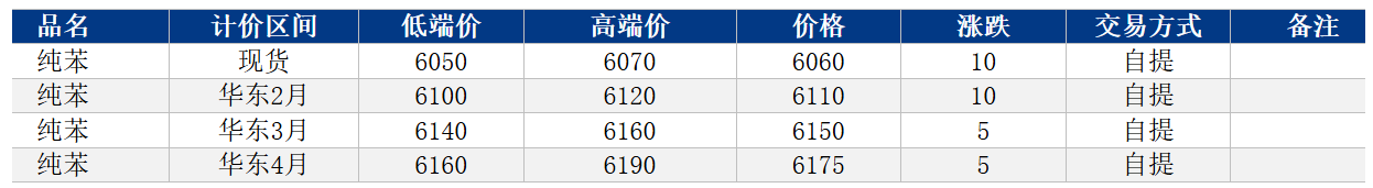 早间,华东纯苯市场现货价格上涨。现货买盘6050,卖盘6070;1下买盘6100,卖盘6120;2下买盘6140,卖盘6160;3下买盘6160,卖盘6190。单位:元/吨。