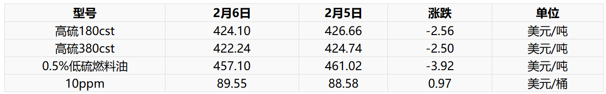 2月6日新加坡燃料油现货市场价格调整