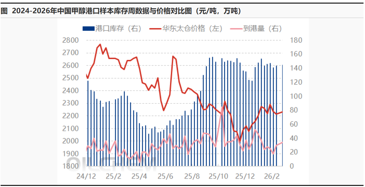 本期甲醇港口库存较节前窄幅积累,虽周期内外轮卸货速度较为一般(两周显性卸入24.24万吨),但假期提货受限同步影响消耗。江苏沿江部分库区有船发支撑提货,但汽运提货寡淡,外轮供应下库存积累;浙江下游表现持稳,卸船不多导致库存下降。本周华南港口库存小幅累库。广东地区周期内进口及内贸船货均有抵港,受假期影响主流库区提货量明显减少,库存呈现累库。福建地区无船货补充,下游开工降低导致消耗速度放缓,提货表现一般,库存窄幅去库。