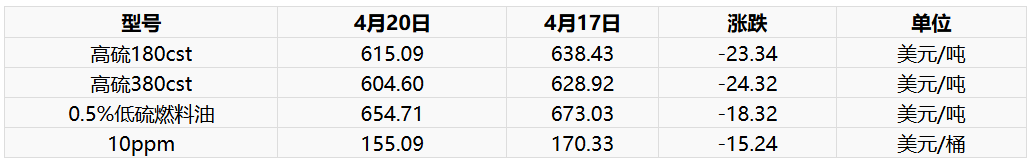 4月20日新加坡燃料油现货市场价格下调