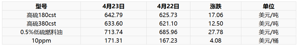4月23日新加坡燃料油现货市场价格上调