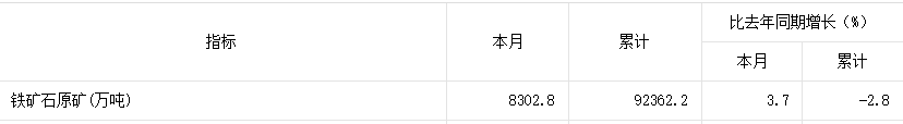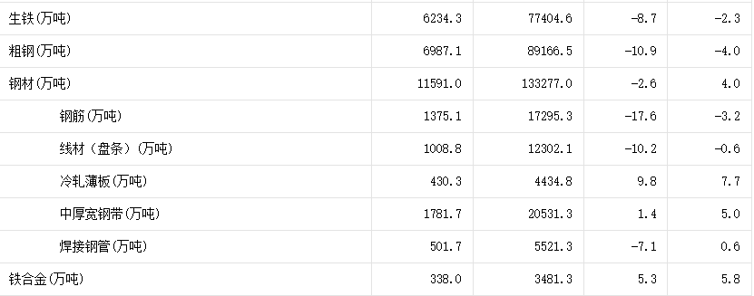 中国国家统计局公布的数据显示:11月份钢材产量为11591万吨,同比减少2.6%; 1-11月份生铁产量为133277万吨,同比增长4.0%;其他数据如下: