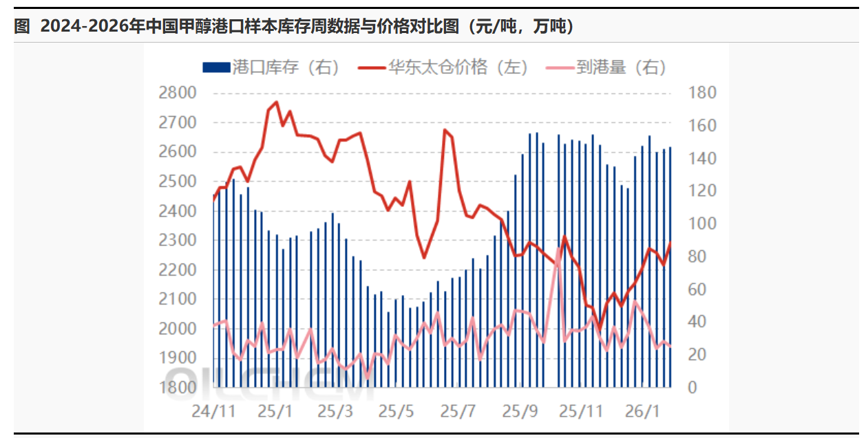 本周甲醇港口库存继续积累,累库主要表现在华东地区,周期内外轮显性卸货19.14万吨,全部卸入华东。周内江苏沿江主流库区提货减弱,浙江有烯烃重启,但总体在外轮供应补充下库存积累。华南地区周内广东仅少量内贸补充,但主流库区提货减弱,因无外轮补充供应,因此库存去库;福建地区周内无卸货,库存同步去库。
