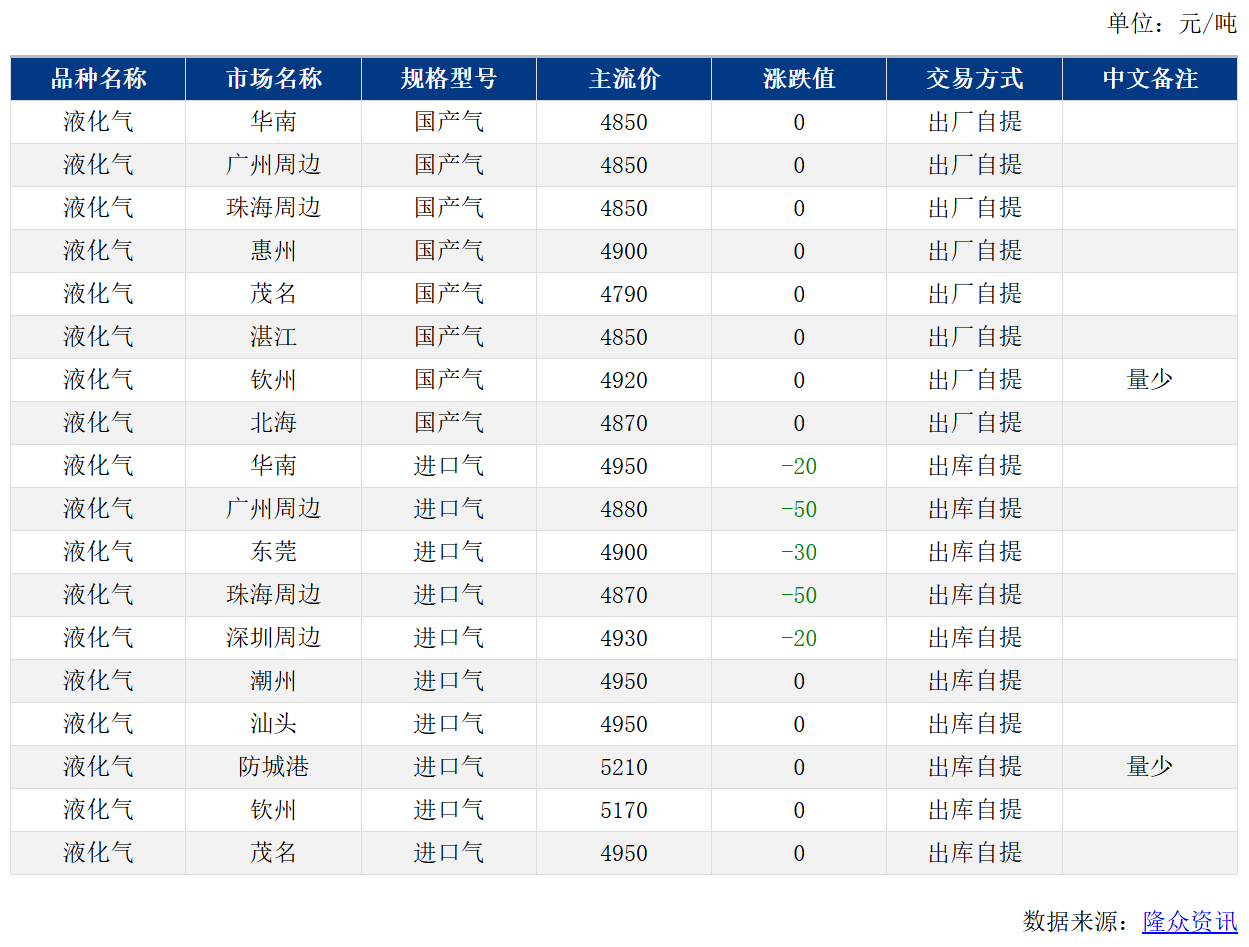 华南地区国产气成交均价在4850元/吨,较昨日价格稳定;华南进口气均价4950元/吨,较昨日价格跌20元/吨。今日华南主营炼厂价格全线持稳,码头成交则稳中有降,珠三角地区今日到船、后续到船计划有所增多,而需求预期呈现下降预期,各方竞相出货下,成交价格松动,市场观望情绪浓厚购销氛围仍清淡,重点关注下午沙特CP官价出台,而考虑到近期到船增加与临近节前以出货为先,市场推涨阻力显著,预计行情将进入僵持整理阶段,高价资源面临回调压力。