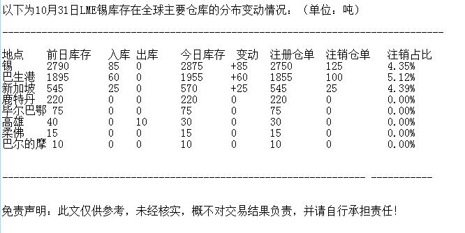 LME 10月31日锡库存分布情况